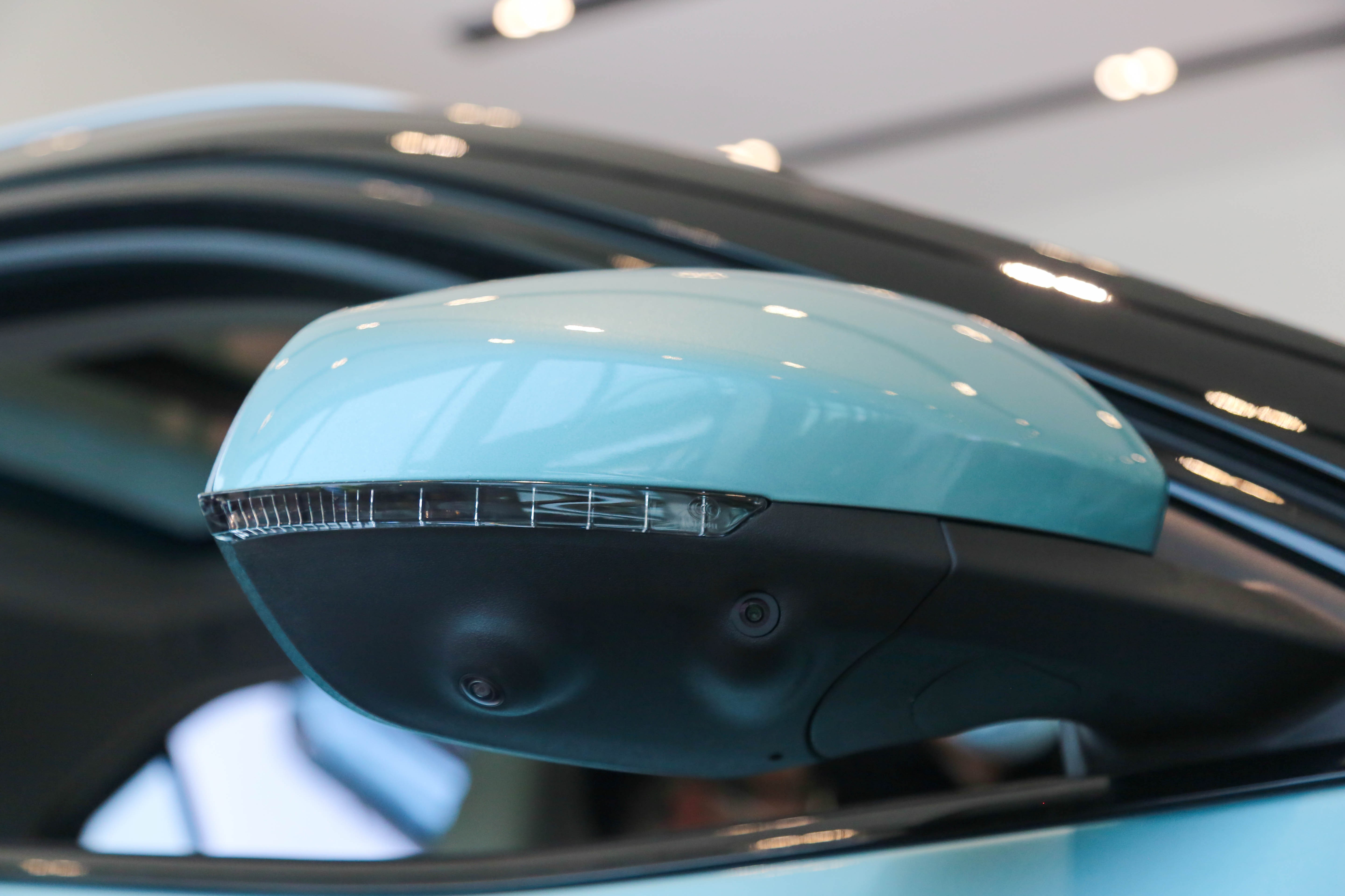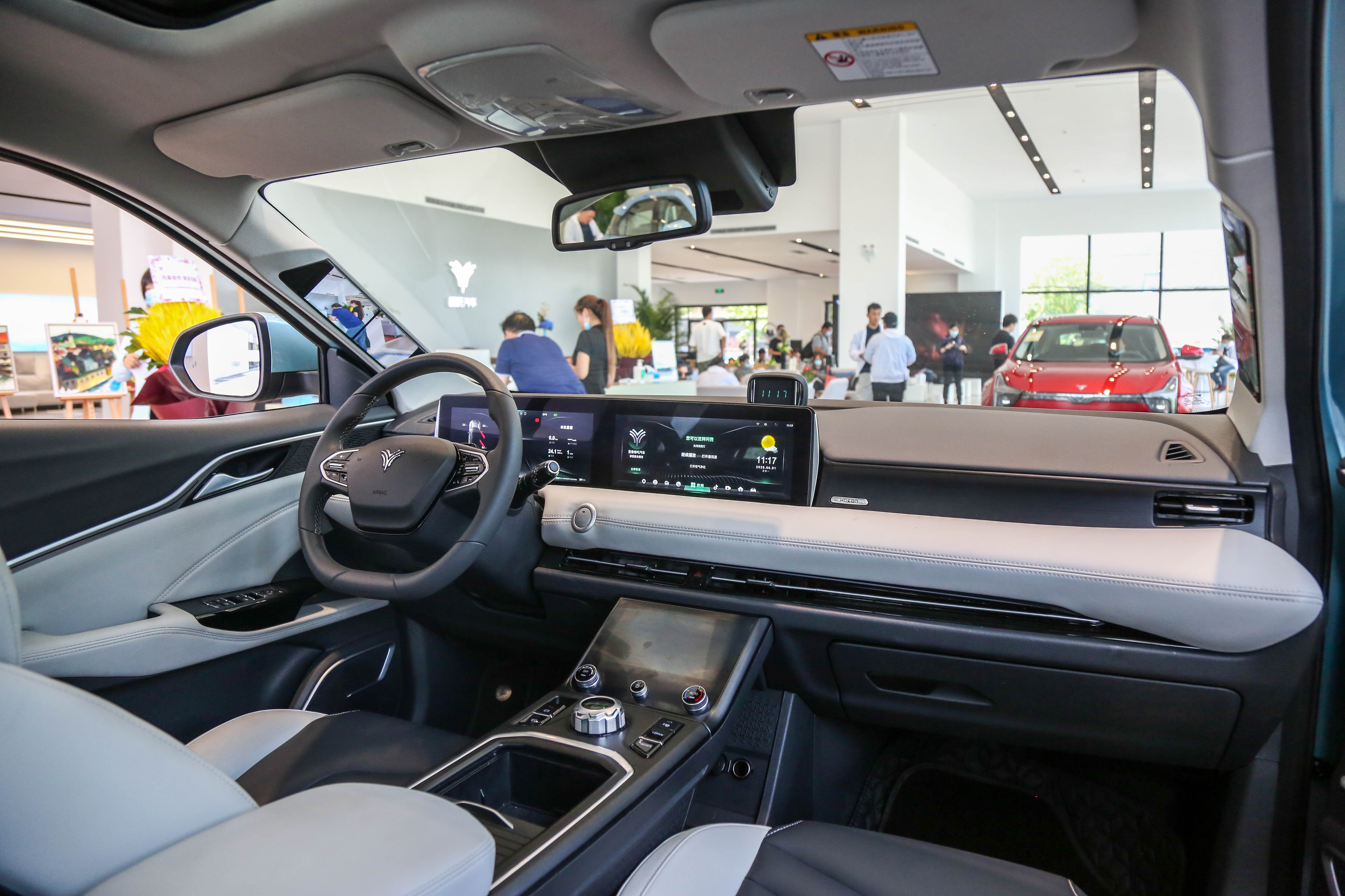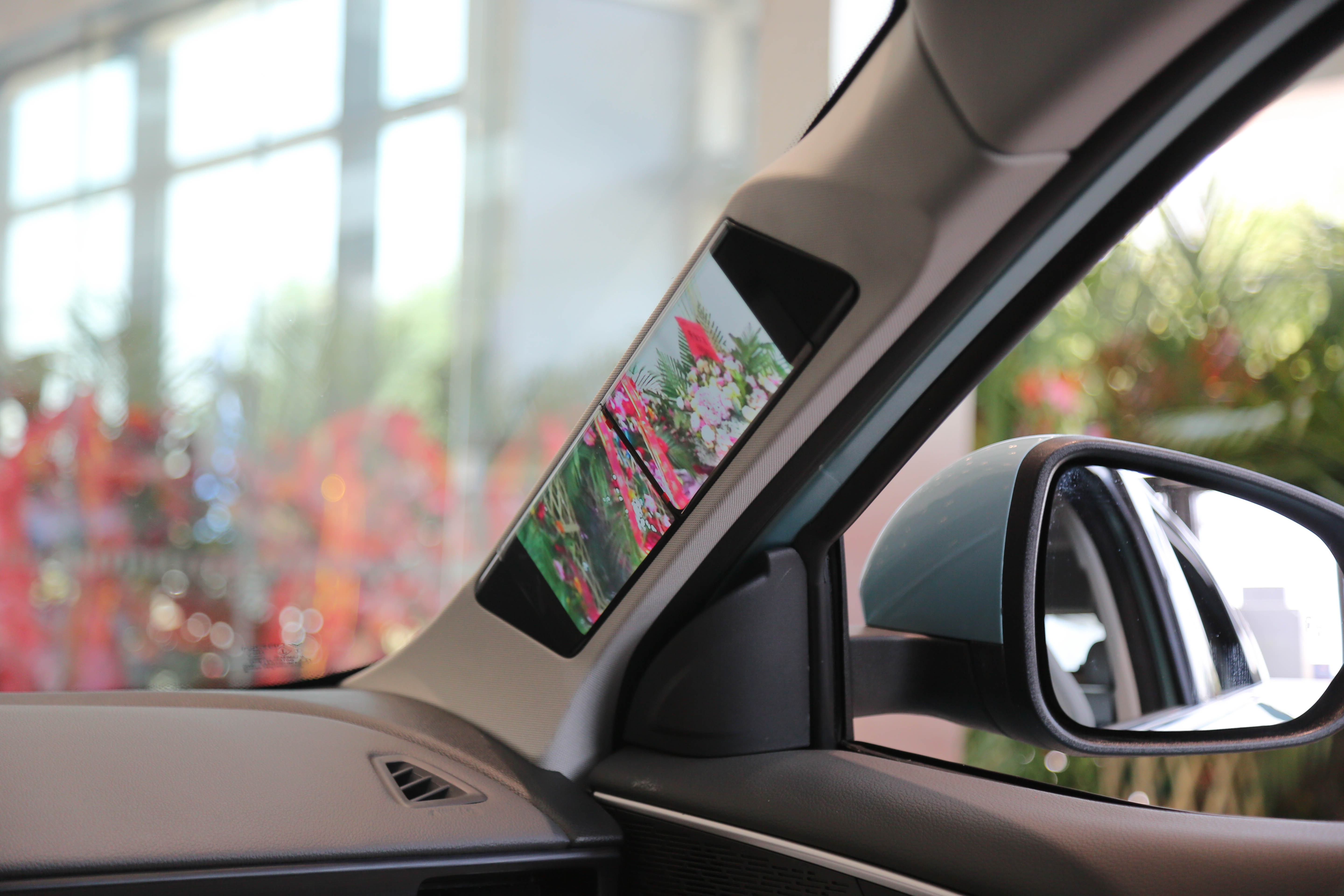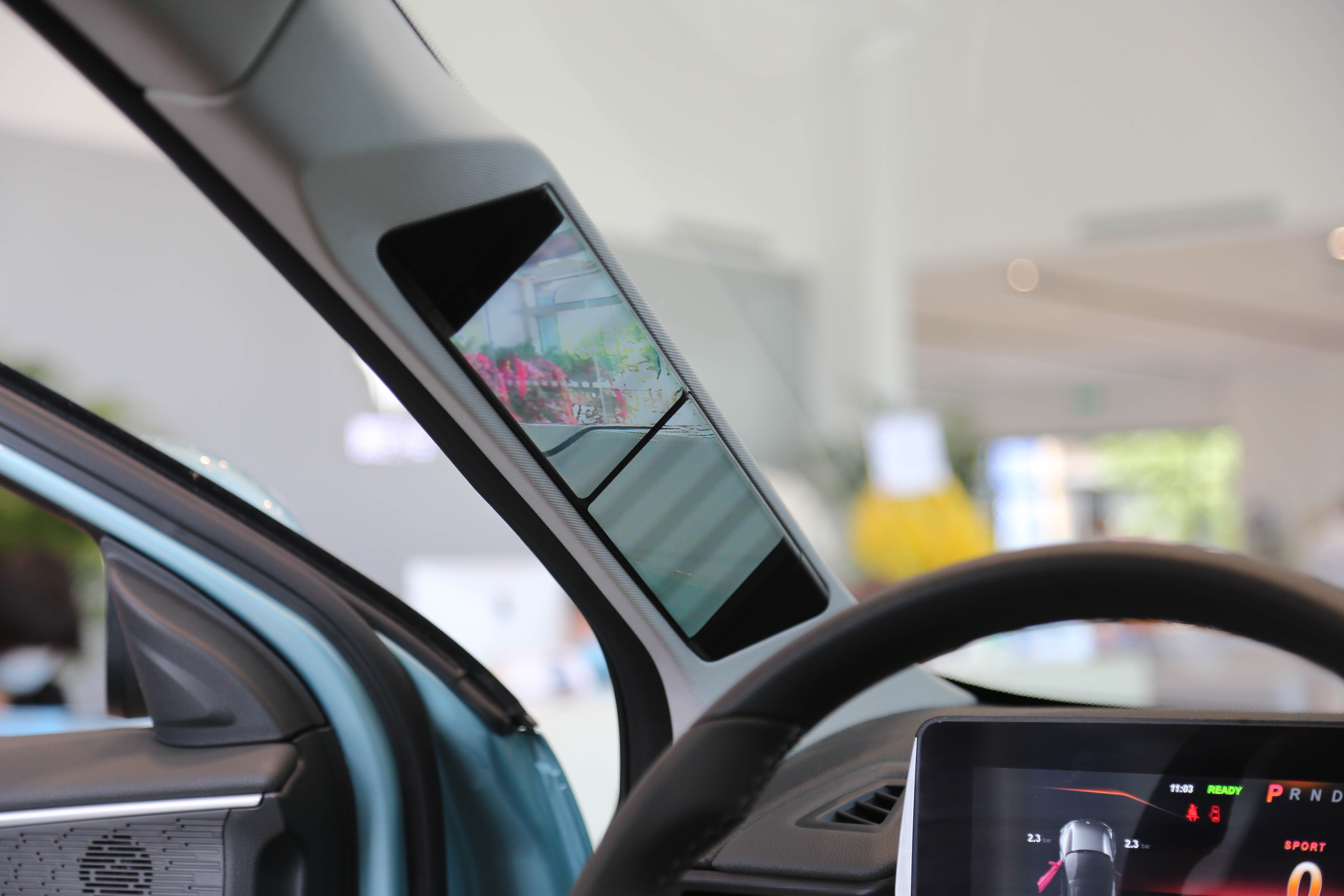 接下来是内饰的重头戏之一,也是哪吒U最大的宣传点之一,那就是“透明”的A柱(仅最高配两款车型可选装,选装价格12000元)。它是基于AR-View系统,通过将OLED柔性屏安装在A柱内侧,配合自主研发的智能软件算法和外部高清摄像头(位于外后视镜),实现A柱透明可视化,主副驾两侧的A柱均有。在未来,还可对显示屏的信息进行选择性显示,个人表示非常期待。