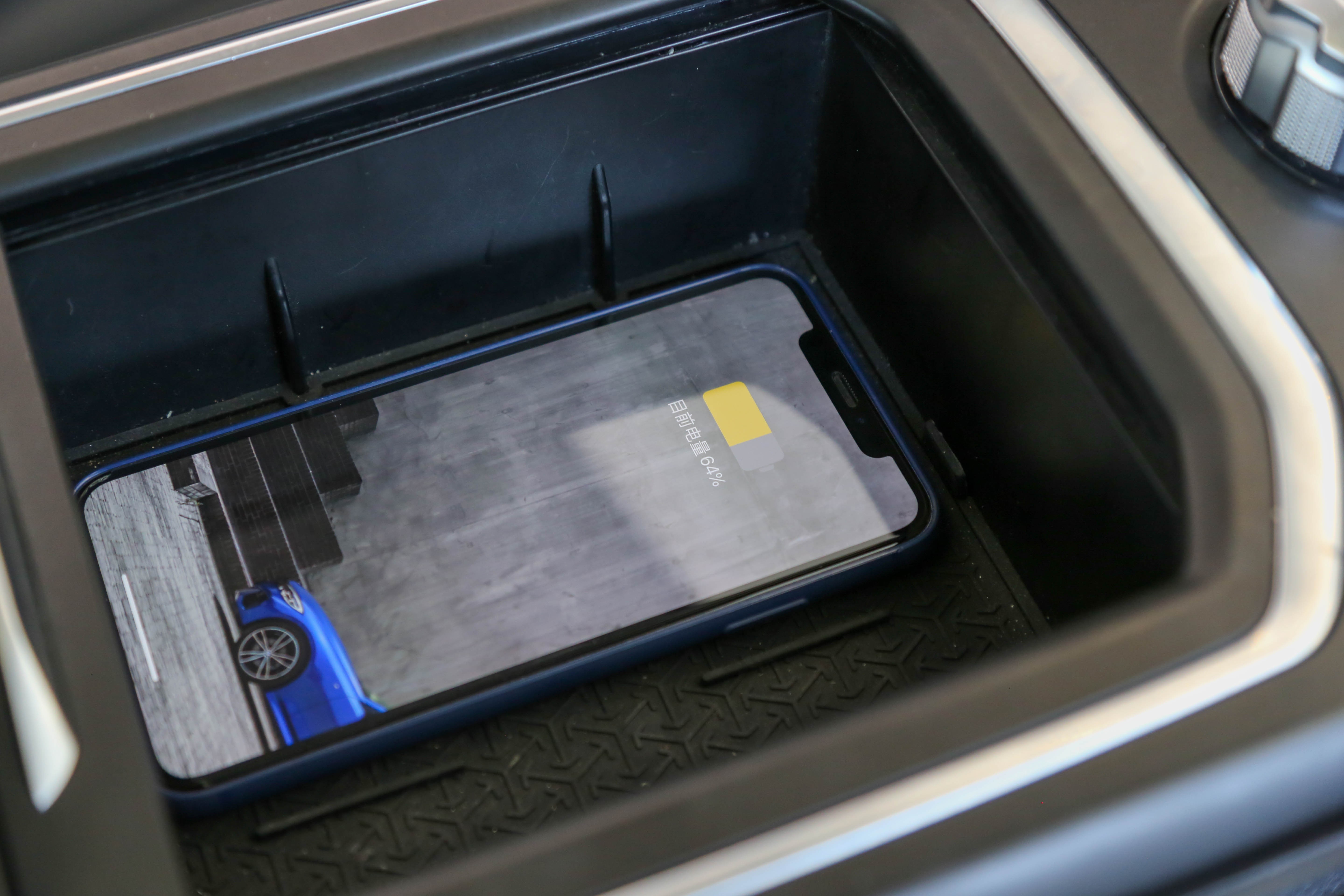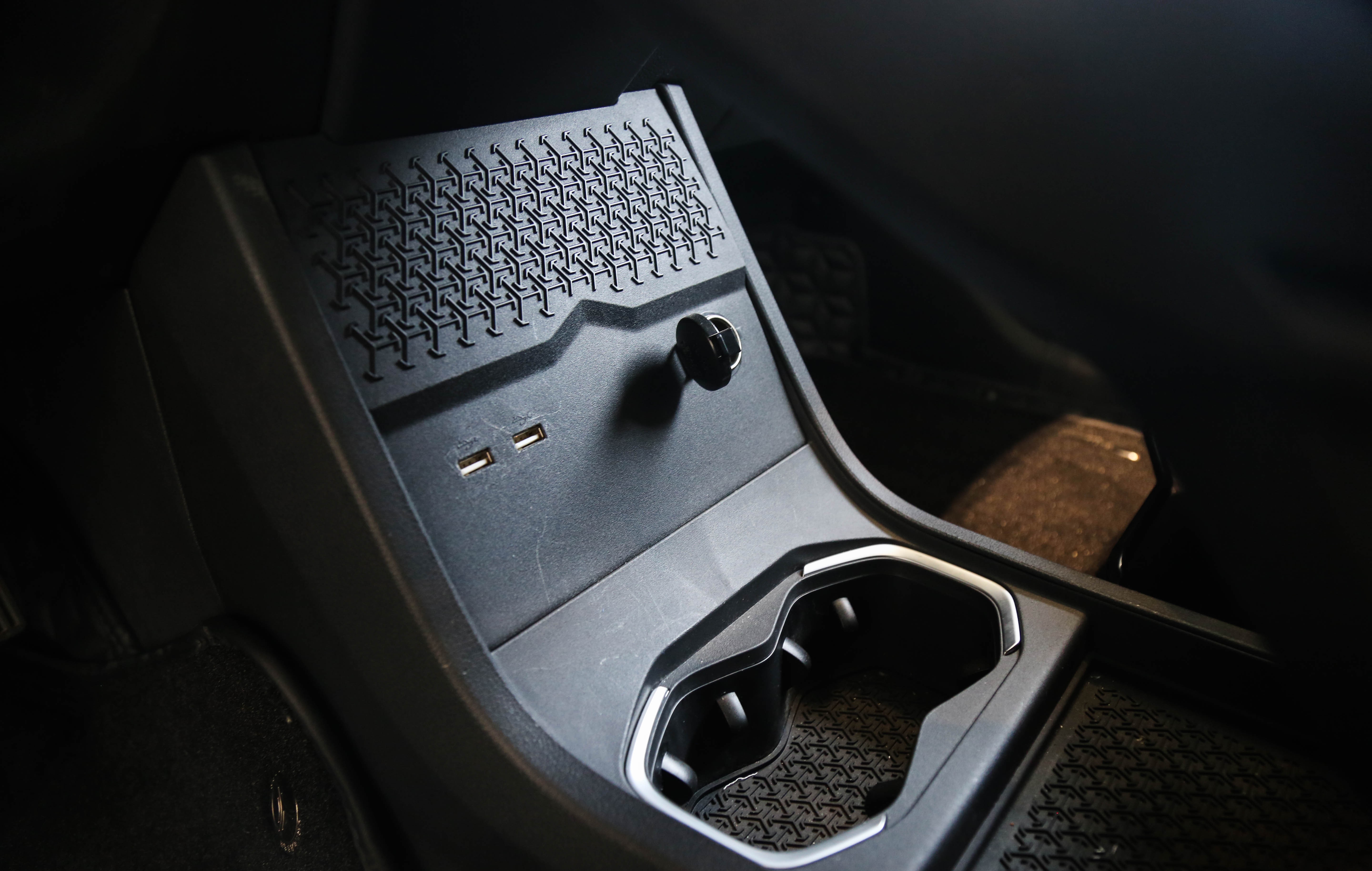 前排的储物空间表现不错,扶手箱前方有一个带卷帘的储物格,并且内置了无线充电。此外,惊喜的是中央通道的下方掏空了一个巨大的储物空间,包含两个杯架、两个USB以及一个点烟器。