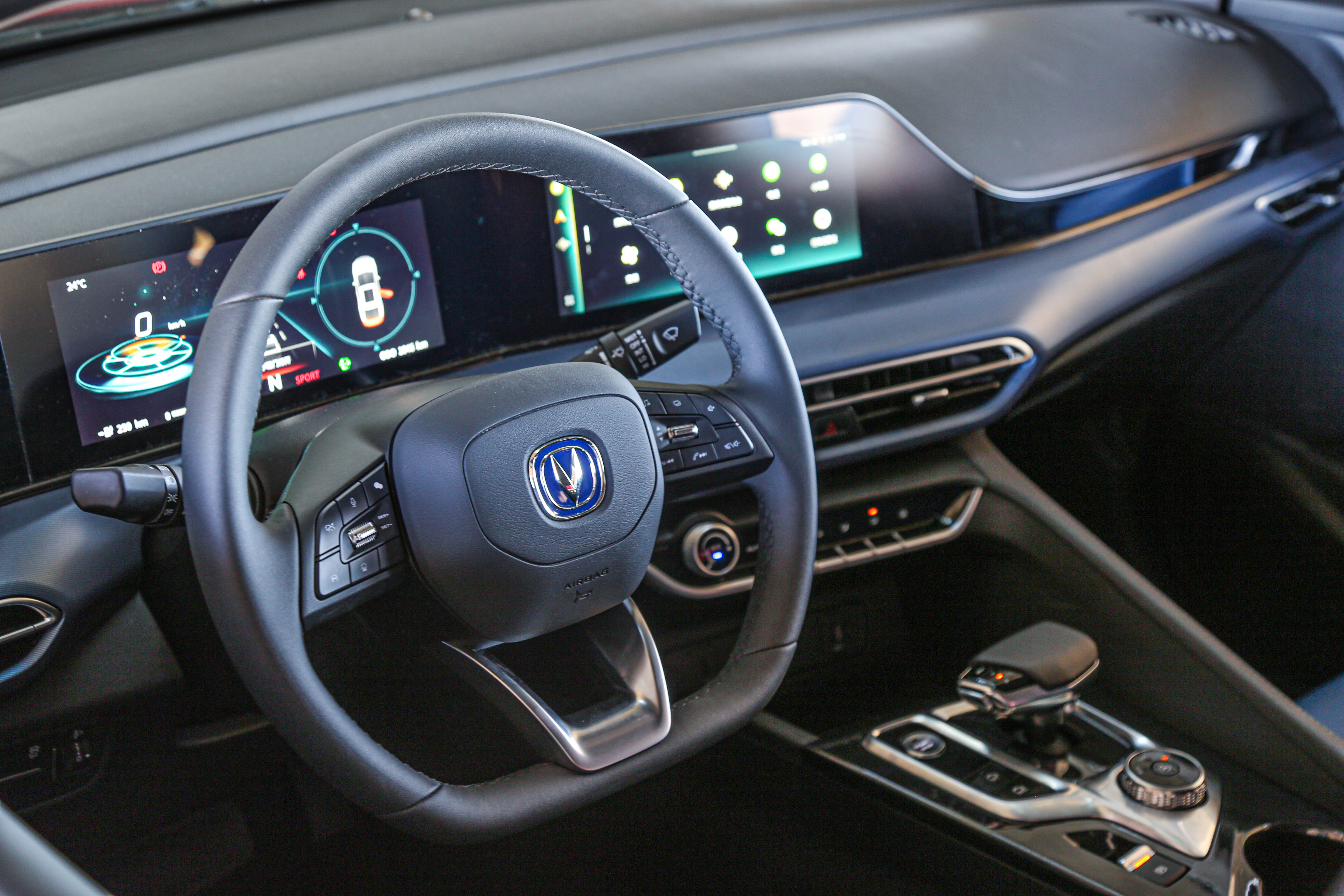 内饰布局与逸动PLUS保持一致,最大区别在于使用了蓝色的饰板装饰,用来凸显其新能源身份,使得内饰氛围多了些质感。