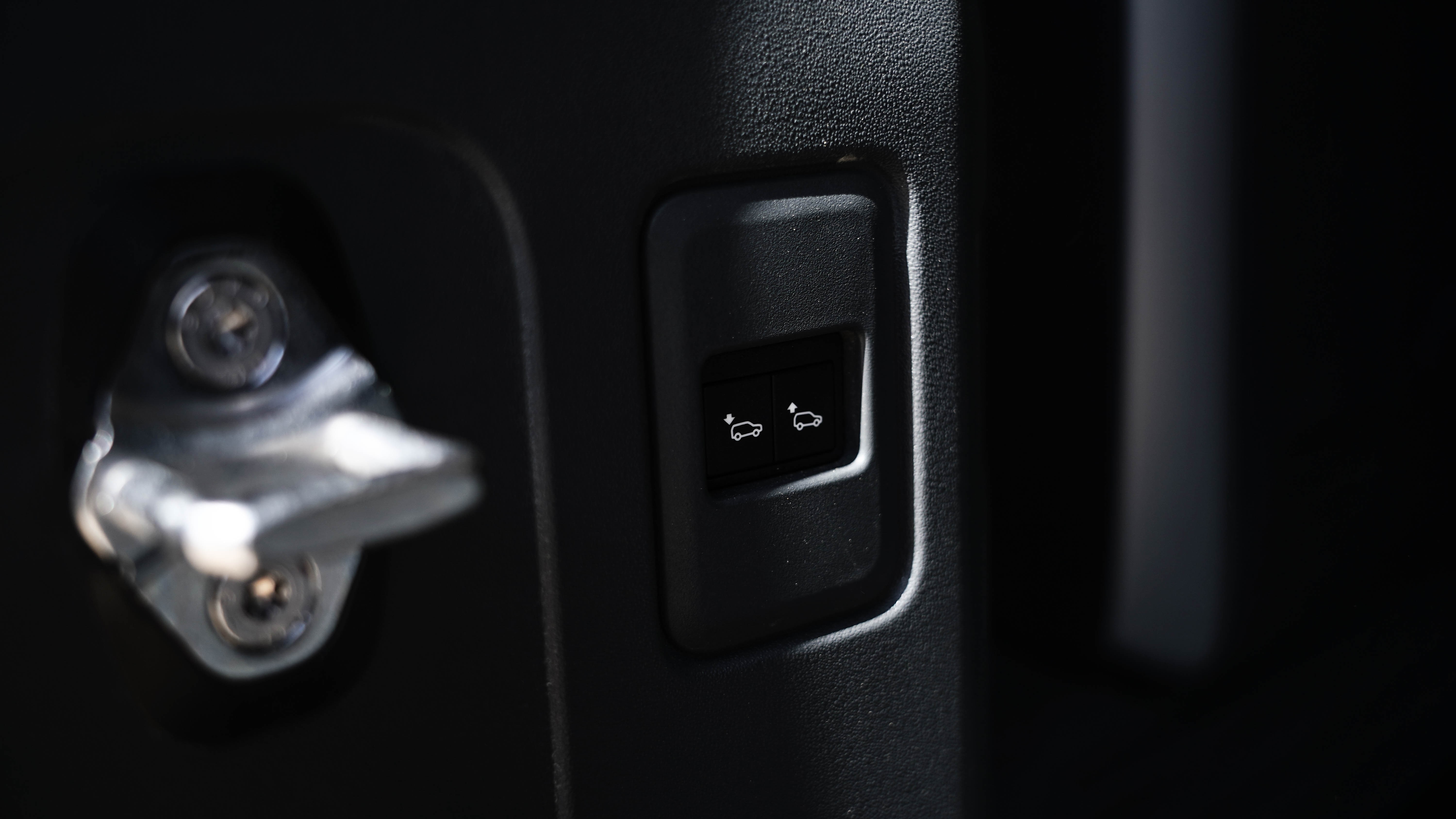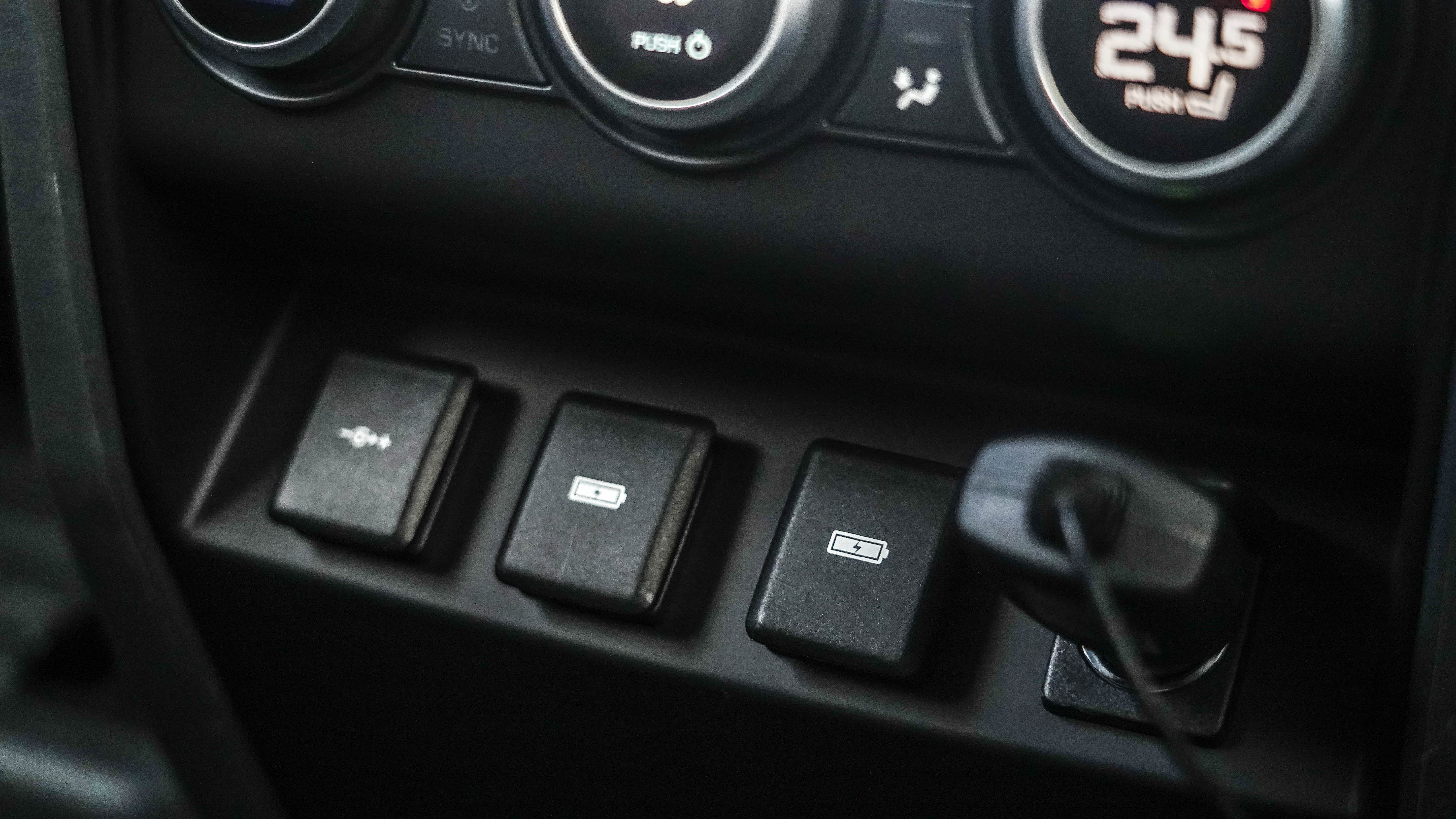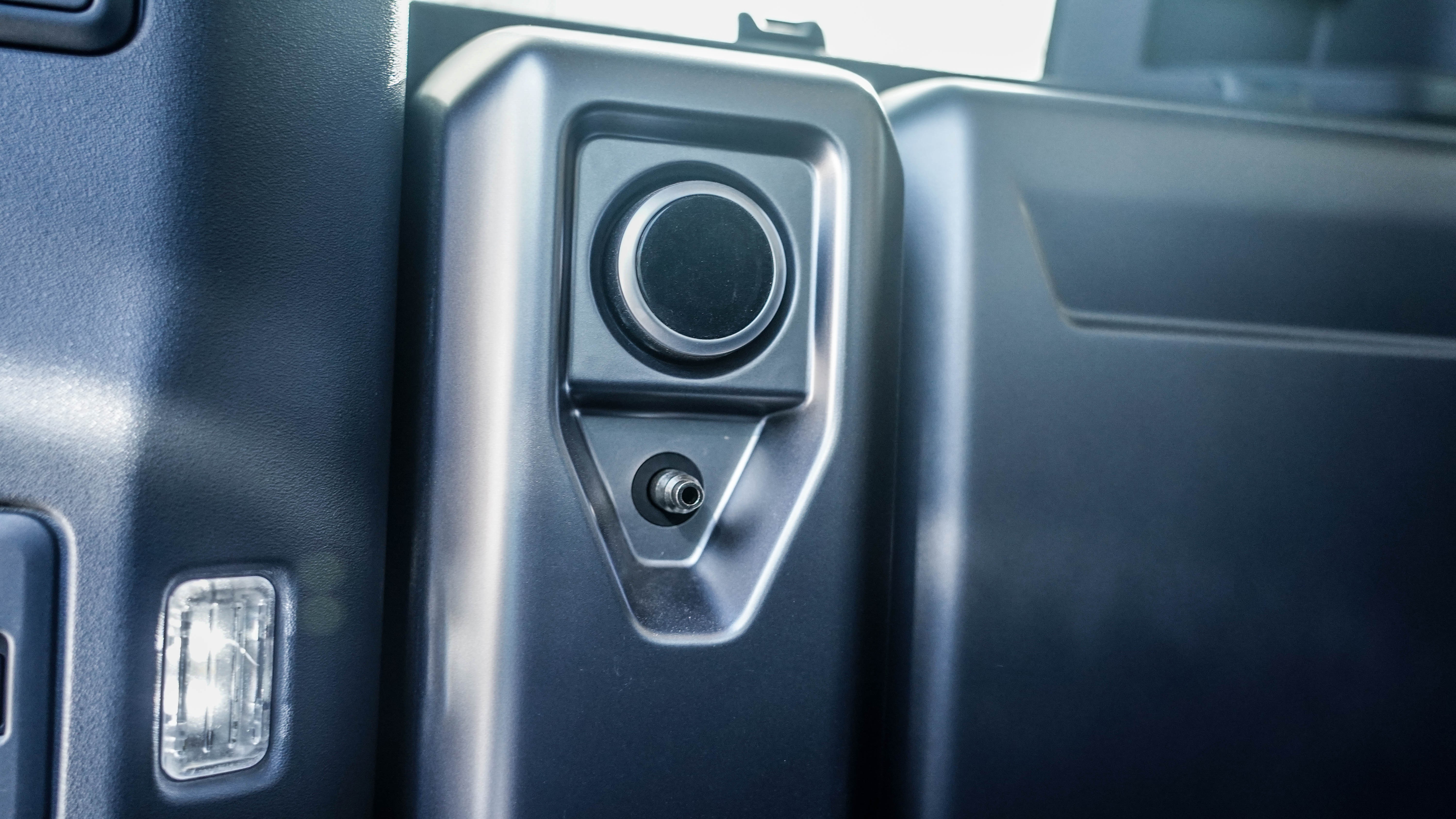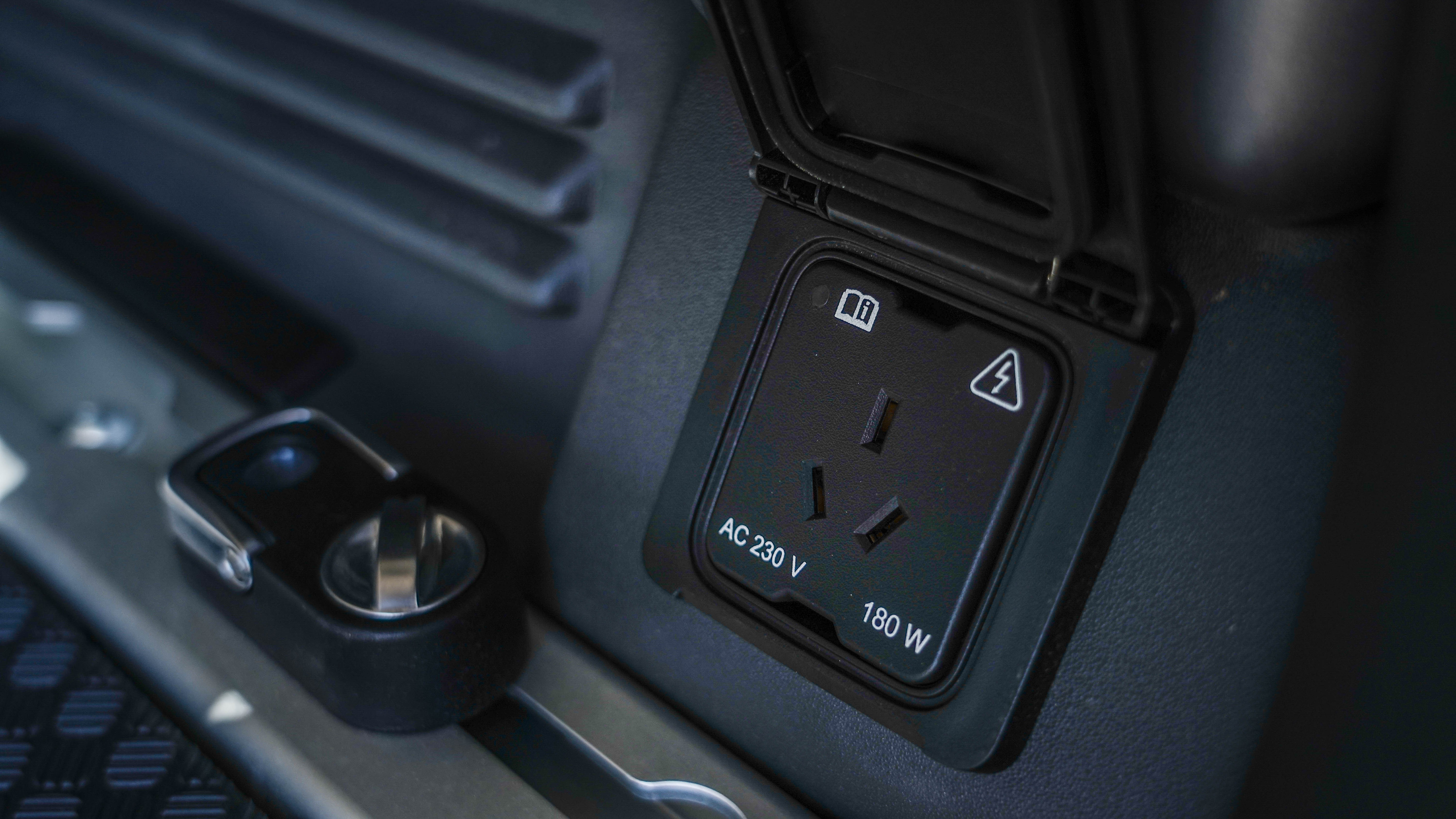 两侧还配有丰富的功能按键,如果在搬重物试觉得后悬架较高,可以通过尾厢左侧的电动按钮去降低后悬架的高度;右侧还有230V的三项插座,可以用来野外野炊等等。