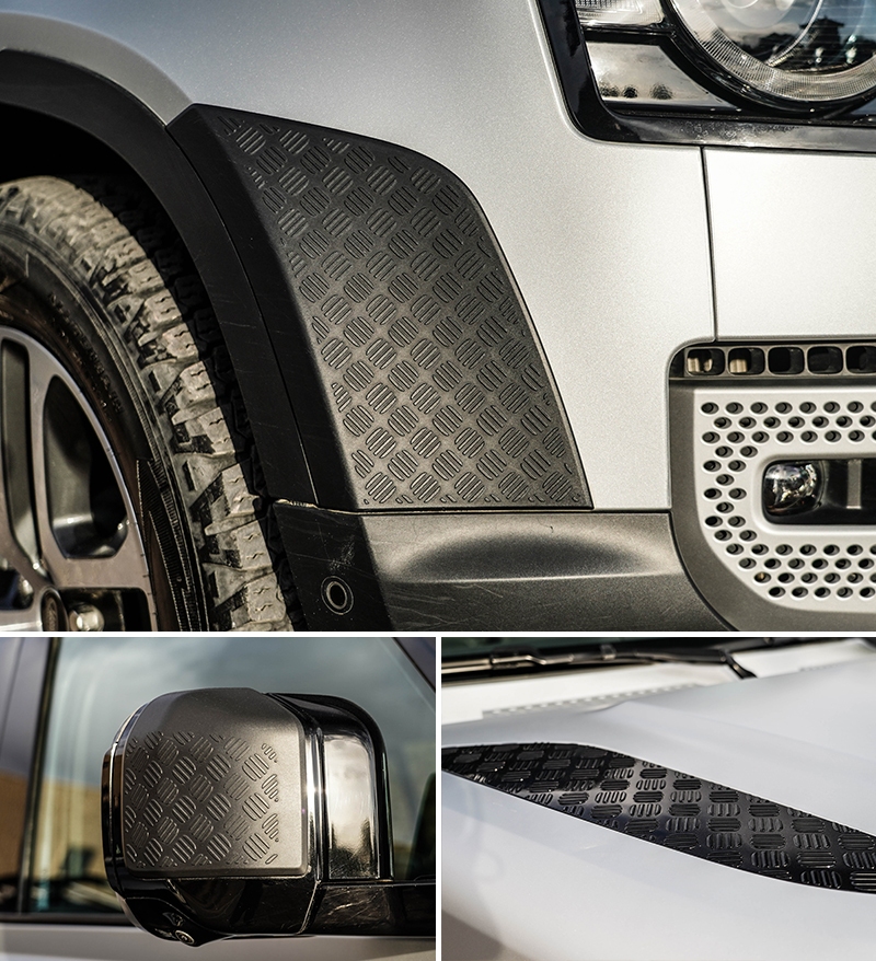两侧轮眉的外凸多了一丝野性,轮拱的前方、后视镜盖、后门轮拱等位置还可以选装3mm厚的网纹塑料,减少越野途中对漆面的刮伤。