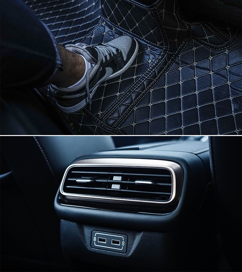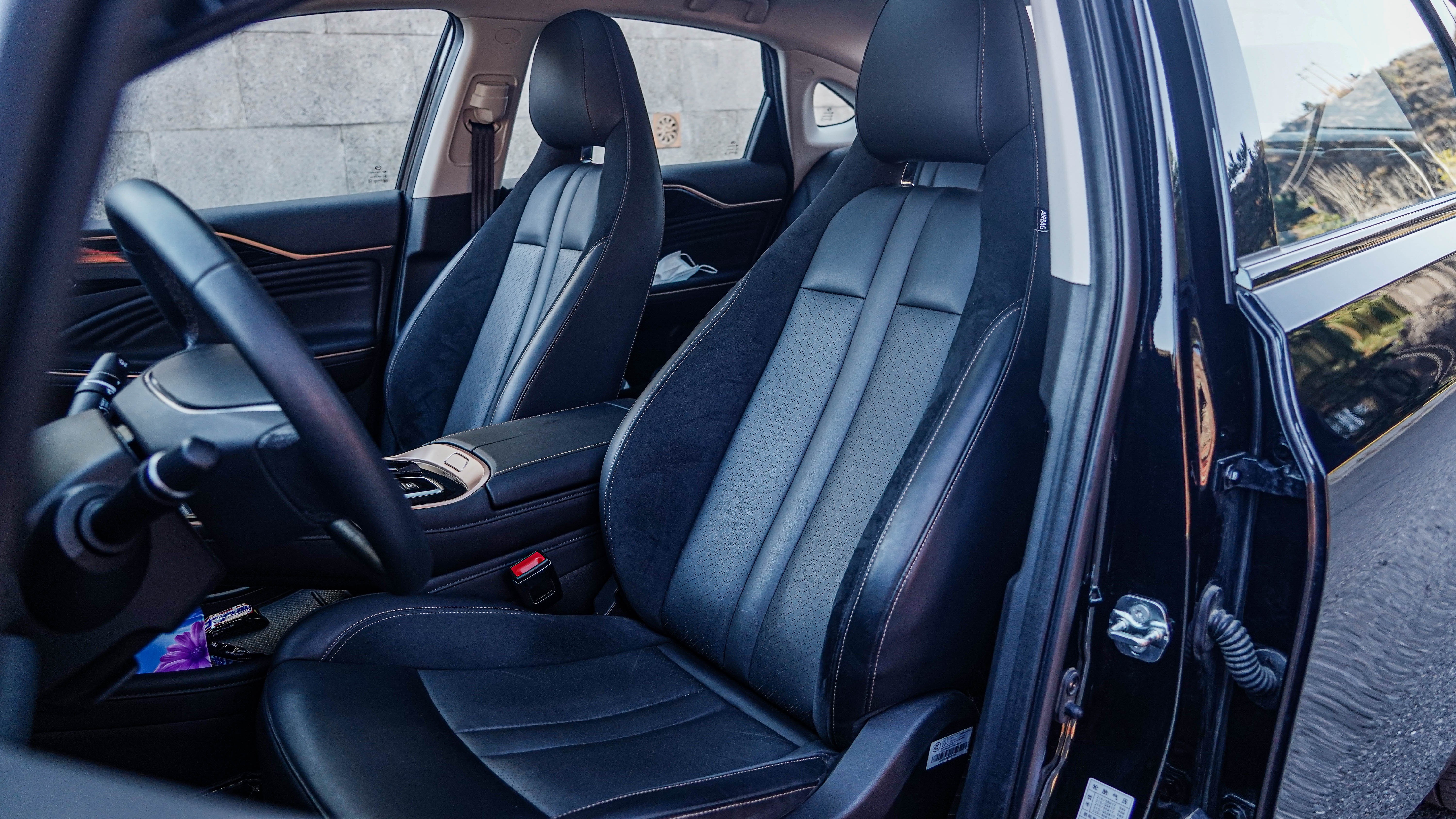 一体式座椅视觉效果很显高级感,而且侧翼还拼接了仿麂皮的材质,后排座椅同样采用这种拼接材质。前排座椅的包裹感可以给好评,后排的腿部以及腰部承托都是不错的。