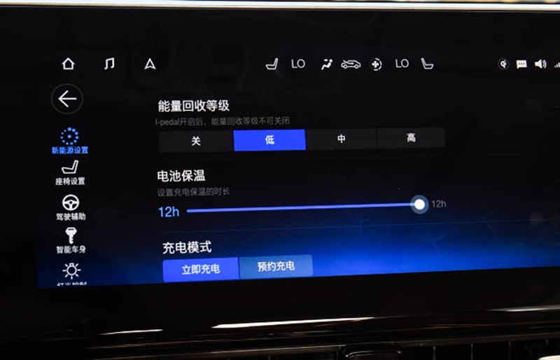 能量回收的等级可以在中控屏中自行设定,分别有“关、高、中、低”四级可选,在I-PEDAL(单踏板)模式下不可改变能量回收等级,系统默认为高等级回收,其余驾驶模式均可随意进行调节。我个人认为中等级回收相对来说是更接近燃油车滑行的状态,更舒服一些,高等级回收很容易引起晕车不适。