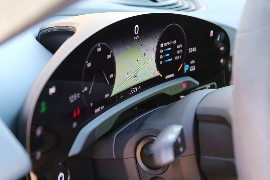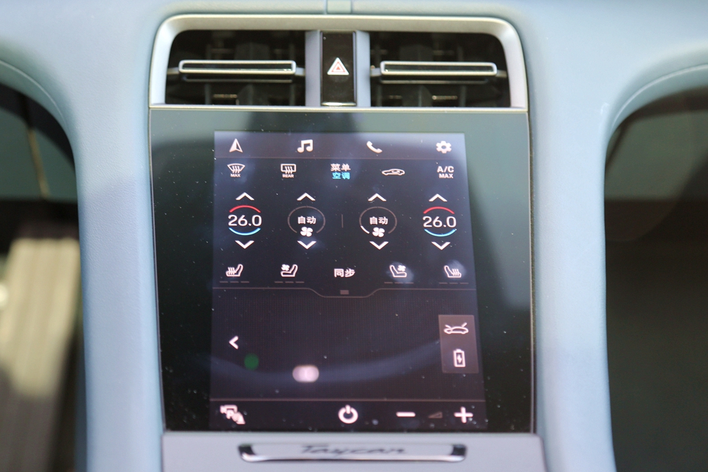 首当其中的是,保时捷Taycan采用了16.8英寸的弧形曲面OLED仪表盘,且没有边框,简单明了。屏幕配有抗眩光涂装,因而也不会产生炫光。左侧为照明控制区,右侧为底盘功能控制区,驾驶员很容易操作。
