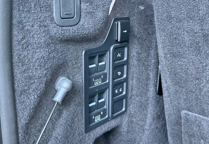 需要介绍的是,我们在后备箱侧面发现了第三排座椅电动折叠和升起的按键,这就省去了复杂的人工操作的烦恼。为了提升后备箱放置物品的便利性,后备箱侧面还设置了可以降低车身高度的按钮。