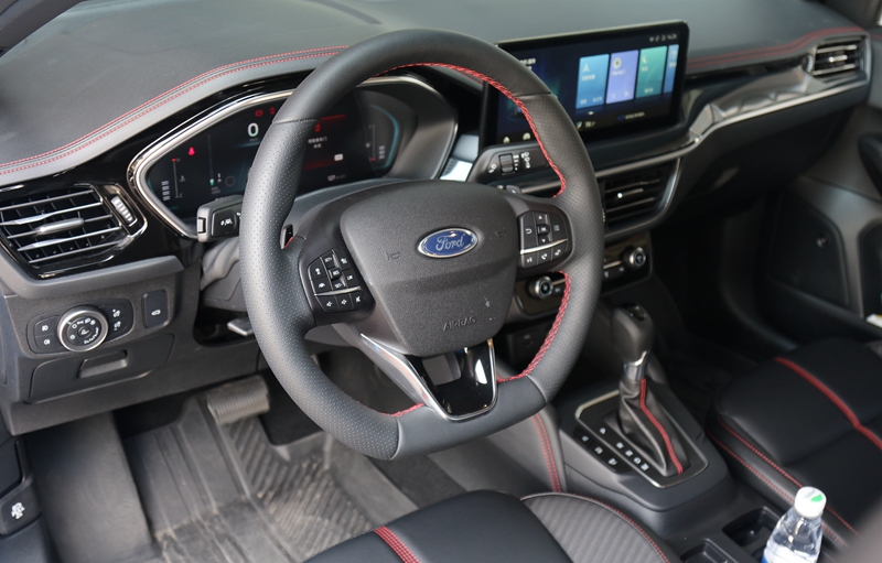 内饰方面,新福克斯尽管在用料上没有过于突出的地方,但营造出来的运动感还是非常到位。包括黑色内饰、平底方向盘、碳纤维风格饰条、带ST-Line刺绣Logo的座椅、还有车内随处可见的红色缝线,运动味进一步油然而生。