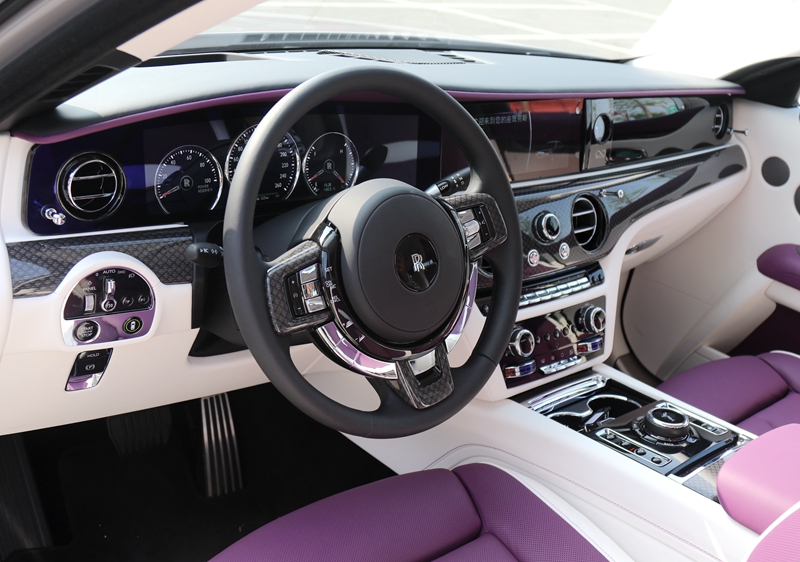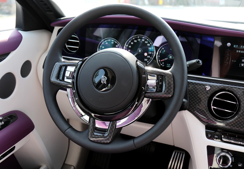 内饰方面,古思特相比幻影的设计更加年轻,此次的试驾车更是用上了骚气红白双色,且古思特绝大部分地方都使用了真皮包裹,甚至是包括座椅靠背等一些细微之处。古思特的星空顶非常炫目,光线可通过真皮的打孔处照射进来。方向盘依旧是劳斯莱斯偏细的设计,显然不是激烈驾驶的风格取向。