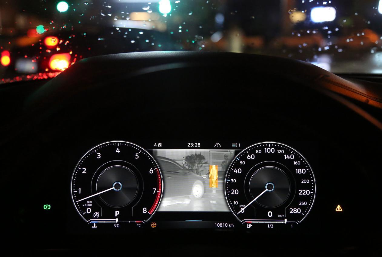 我们在下雨的深夜体验了途锐的夜视系统,该系统通过方向盘按钮即可切换显示,行人识别的黄色边框十分醒目。在使用过程中,至少20米以外的行人都可以识别。但如果有人骑电动车快速经过,摄像头可能会捕捉不到。但好在途锐的车灯比较亮,仍然可以保证夜间的驾驶安全。