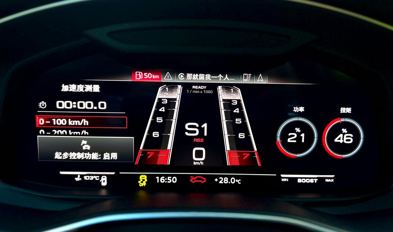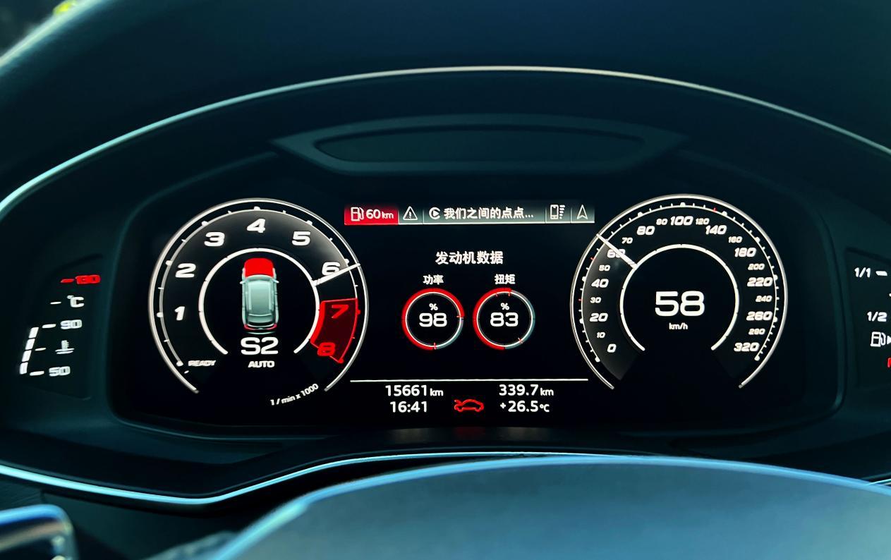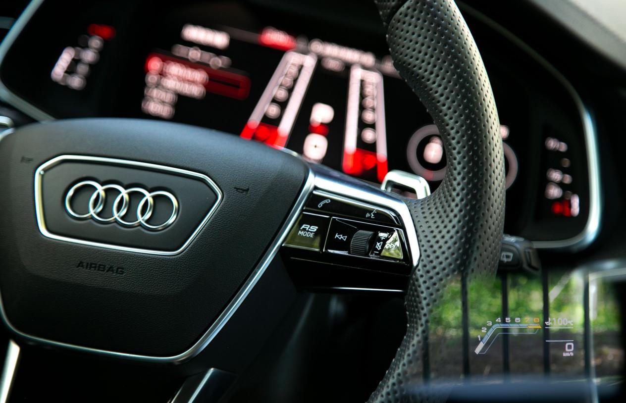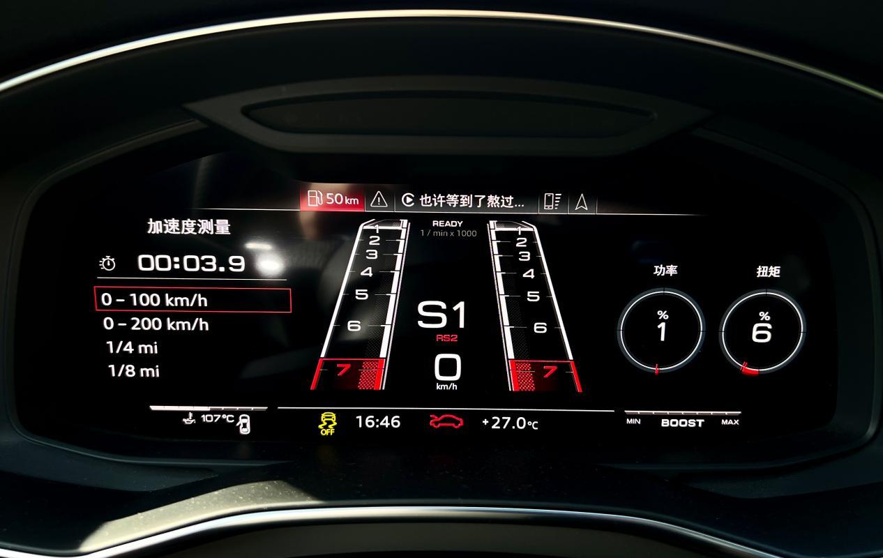 但如果你在买菜过程中还想“浪”一下,奥迪RS6 Avant也是最惯着你的那一台车。驾驶模式调整到“AUTO”,挂入S挡,发动机怠速转速会随之升高,排气声浪也随之变大,仪表盘上调出功率和扭矩的显示让你不知不觉地进入到紧张状态。