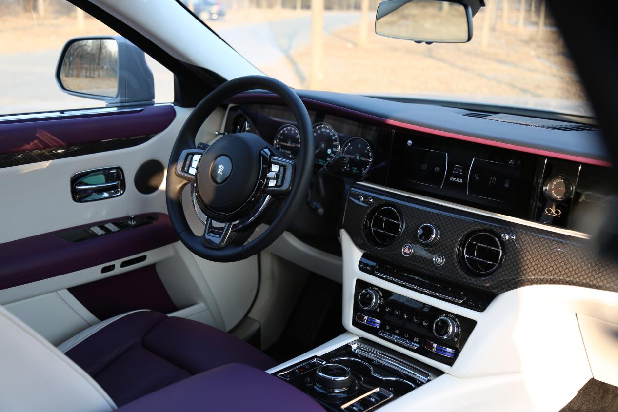 因为全灰色车身搭配着黑色车窗边框,同时,我们常见的亮银色帕特农神庙中网和“欢庆女神”立标,都被选装成了接近黑的钨钢色,如此搭配让人肾上腺素飙升。