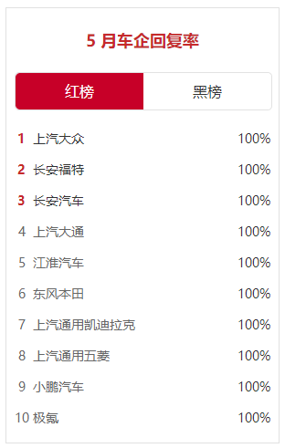 据中国网汽车投诉平台的车企回复率榜单显示,上汽大众、长安福特、长安汽车、上汽大通、江淮汽车、东风本田、上汽通用凯迪拉克、上汽通用五菱、小鹏、极氪等共计43家车企,5月份均实现了100%的回复率。