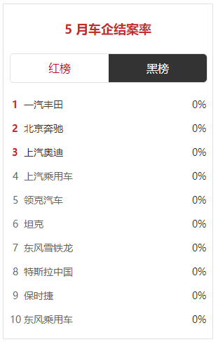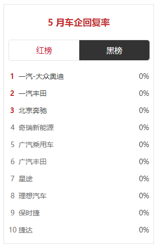 而在车企回复率黑榜榜单上,一汽-大众奥迪、一汽丰田、北京奔驰、奇瑞新能源、广汽丰田、星途、理想汽车、保时捷等5月份的回复率均为0。