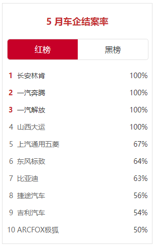 2024年5月份中国乘用车月度实现100%结案率的车企分别为长安林肯、一汽奔腾、一汽解放、山西大运。同时,上汽通用五菱、东风标致、比亚迪、捷途汽车、吉利汽车、ARCFOX极狐等车企的结案率也高于50%。
