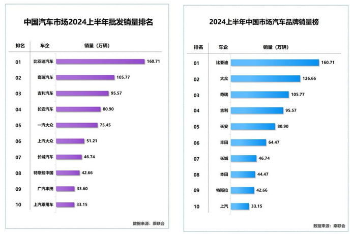其中“卷王”比亚迪可谓“遥遥领先”,其上半年以160.7万台的销量独占鳌头,同比增长28.8%,也斩获中国汽车市场无需定语的销量冠军。紧随其后的奇瑞、吉利、长安,则分别斩获105.7万台,95.5万台和80.8万台销量。从品牌维度讲,比亚迪也力压大众、丰田、本田等一众合资品牌,成为中国市场汽车品牌销量榜的冠军。此外,今年新能源乘用车渗透率已超过50%,购买燃油车也正在成为少数派。