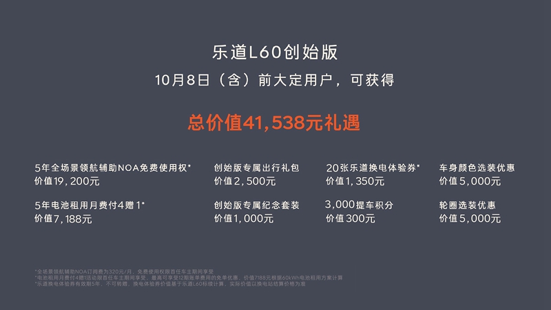 此外,10月8日前大定的用户,均为乐道L60创始版,可享受包含5年全场景NOA免费使用权、20张换电体验券、5年电池租用付4赠1等权益。