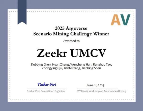 在被誉为“自动驾驶算法奥林匹克”的CVPR研讨会上,吉利千里浩瀚智驾团队在Argoverse2 2025场景挖掘挑战赛中击败一众全球顶尖车企及研究团队,斩获世界冠军。在欧美主导的顶级赛事中夺冠,意味着中国车企在自动驾驶核心算法领域打破了欧美垄断,不仅实现对欧美传统强手的超越,而且具备了规则定义权。